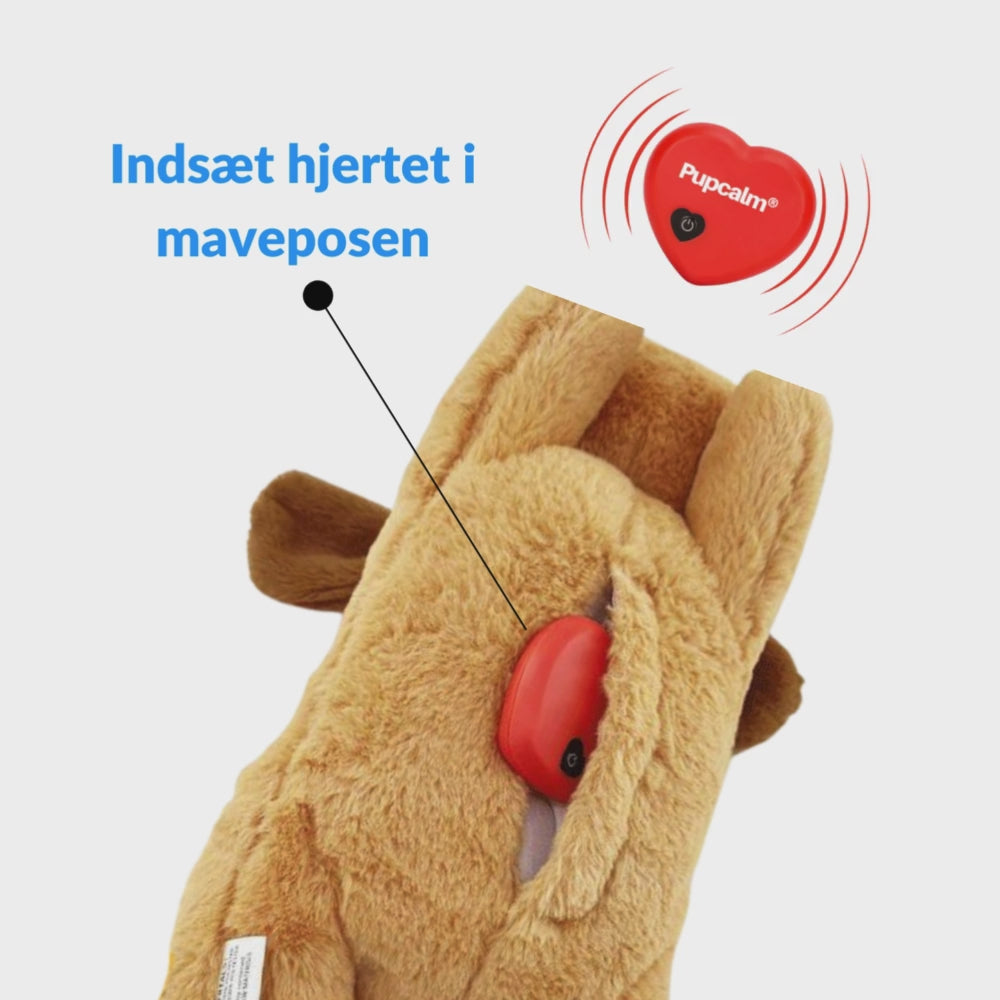 Es besteht aus einem weichen Stofftier mit einem speziellen Innenbeutel. Dieser Beutel enthält ein patentiertes Gerät zur Simulation eines Herzschlags, das rhythmische Pulsationen erzeugt. Aktiviert ahmt Pupcalm™ die beruhigenden Empfindungen nach, die ein Welpe beim Kuscheln mit seiner Mutter oder seinen Geschwistern empfindet.